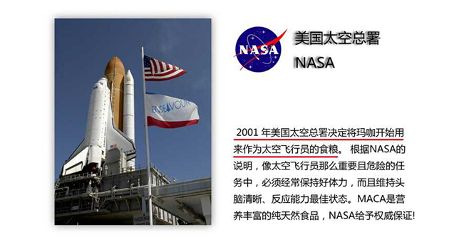 · 2001年-美國(guó)太空總署(NASA)首次將瑪咖(Maca)作為宇航員的太空糧食。