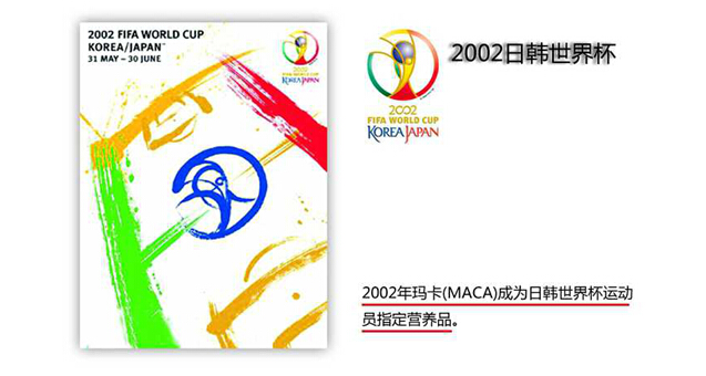 · 2002年-瑪咖(Maca)成為韓日世界杯運(yùn)動(dòng)員指定營(yíng)養(yǎng)品。